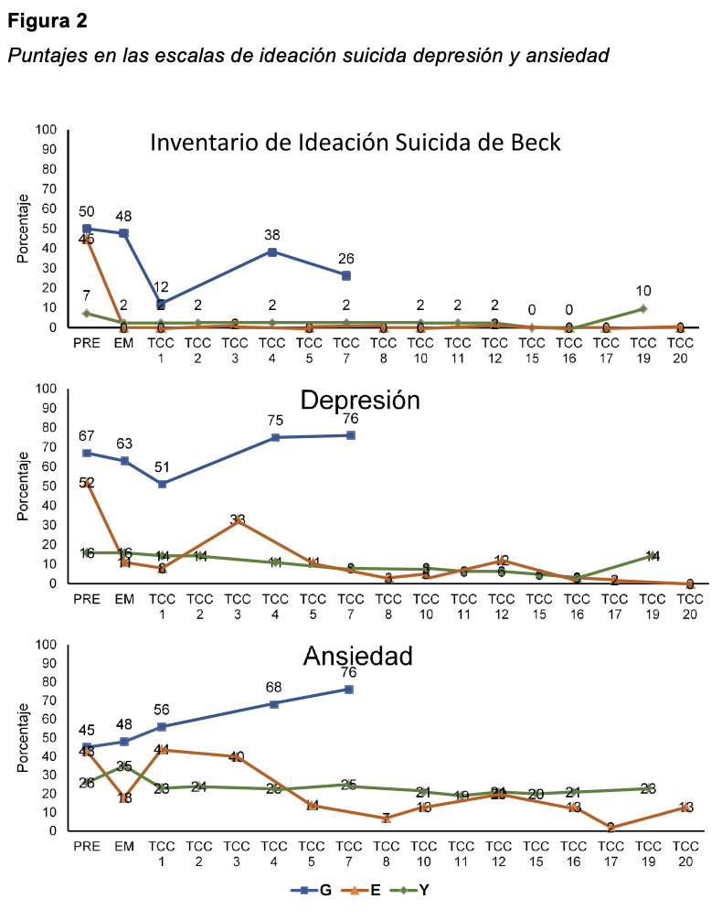 Para E las tres variables se comportaron de manera similar; antes de iniciar la intervención se mostró una disminución en los puntajes, los cuales guardaron una tendencia a la baja hasta concluido el abordaje. En la Figura 2 también se puede observar un pico en las primeras sesiones de tcc, en los síntomas de depresión y ansiedad, pero no así en ideación suicida.