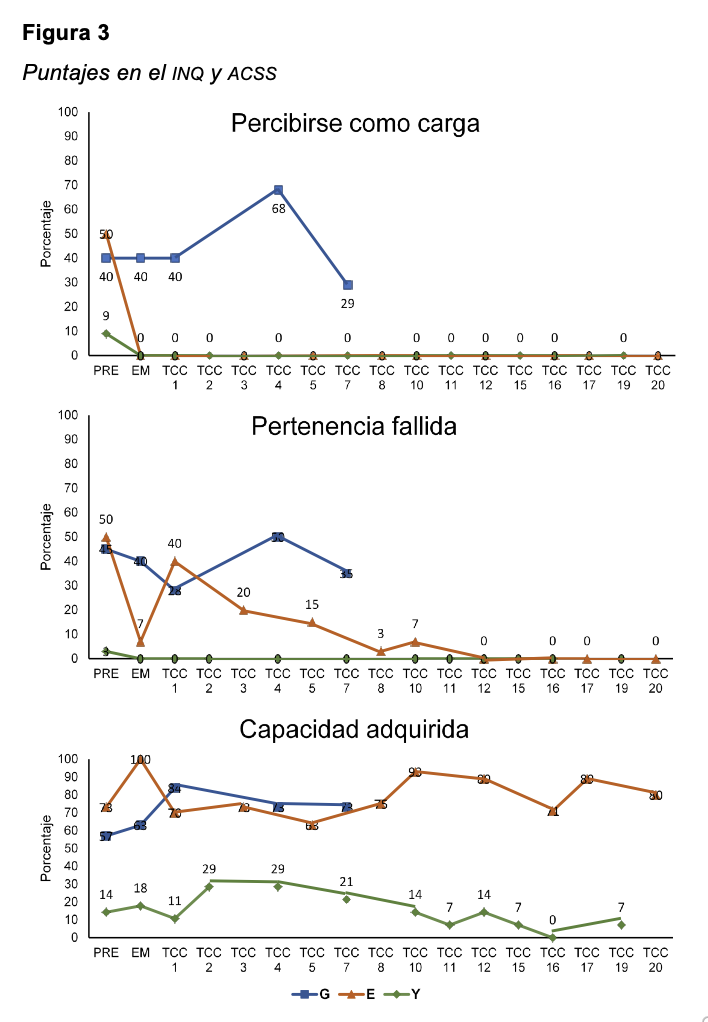 Y alcanzó puntuaciones bajas en percibirse como carga y pertenencia fallida; luego de iniciada la intervención ambas variables alcanzaron el puntaje mínimo, lo cual se mantuvo hasta la última medición. En la capacidad adquirida se observa una leve tendencia a la baja a partir de la cuarta sesión de tcc.