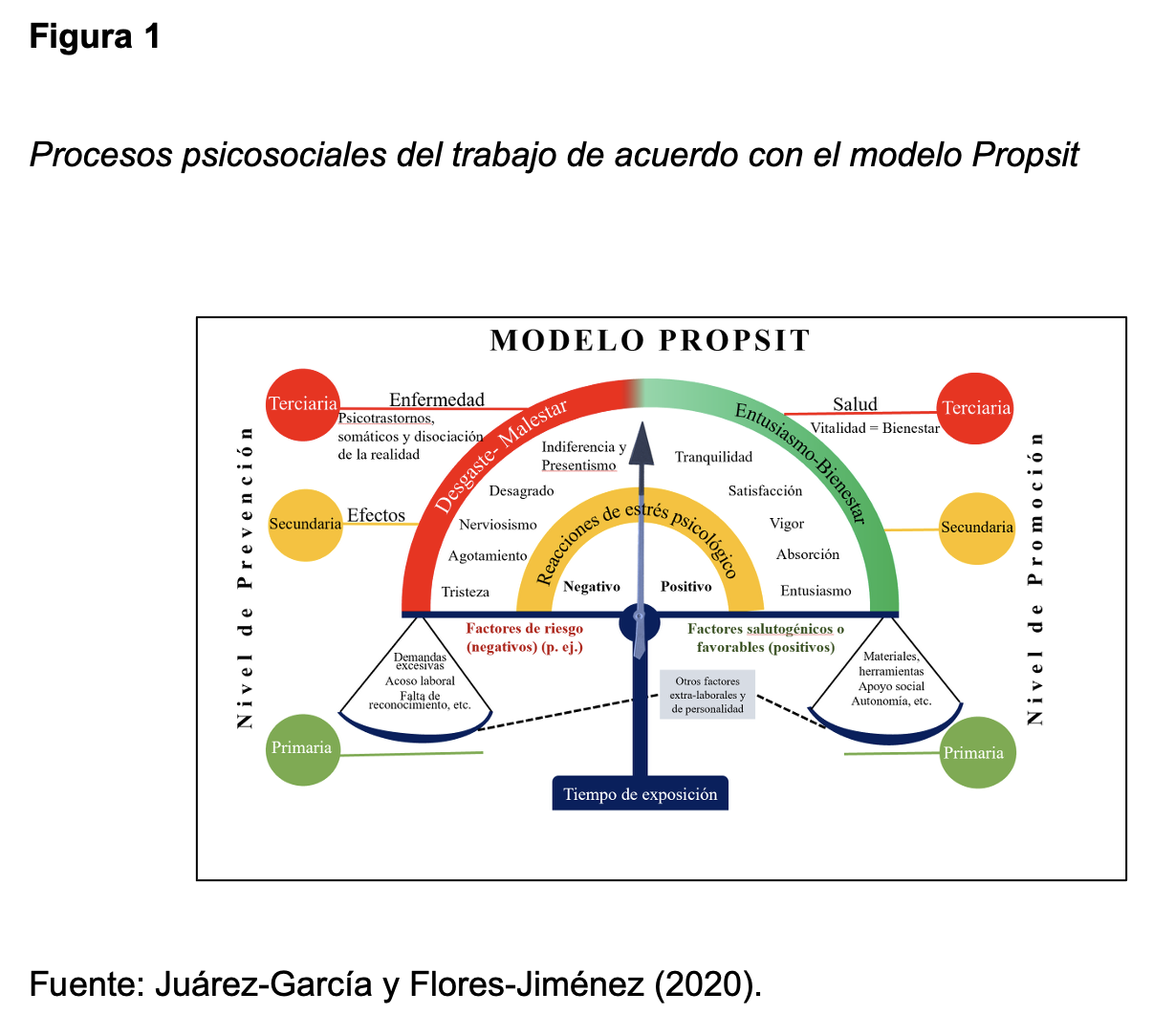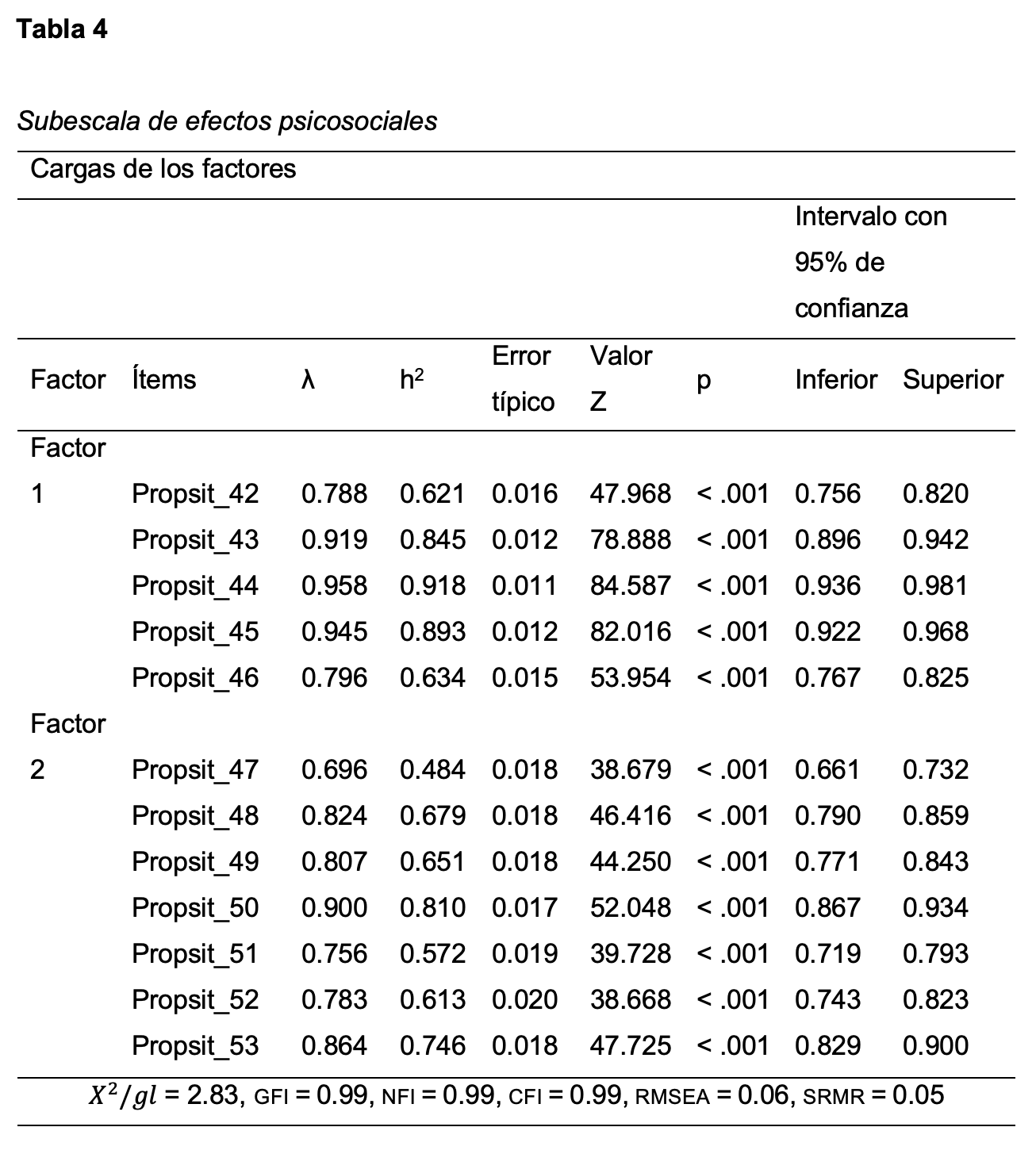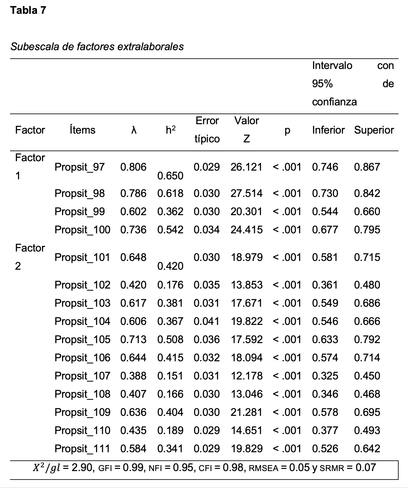 En los resultados de los análisis factoriales exploratorios y confirmatorios del estudio original de validación del Propsit, se reportó una estructura coherente y teóricamente sólida, con índices de ajuste satisfactorios (cfi, gfi, nfi > 0.90; rmsea < 0.08) y niveles adecuados de confiabilidad (α y ω > 0.70). Los autores concluyen que el Propsit es una herramienta válida y confiable para contextos laborales en México, aunque señalan la necesidad de futuras investigaciones en otras poblaciones y sectores, así como fortalecer el modelo mediante la inclusión explícita de factores extralaborales, de personalidad y especificidades culturales (Juárez-García & Flores-Jiménez, 2020).