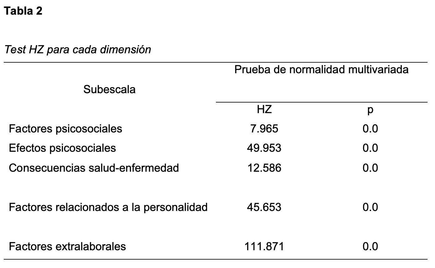 Previo al afc se procedió a estimar la normalidad multivariada mediante la prueba de Henze-Zirkler (hz) para cada una de las subescalas (Mecklin & Mundfrom, 2005).