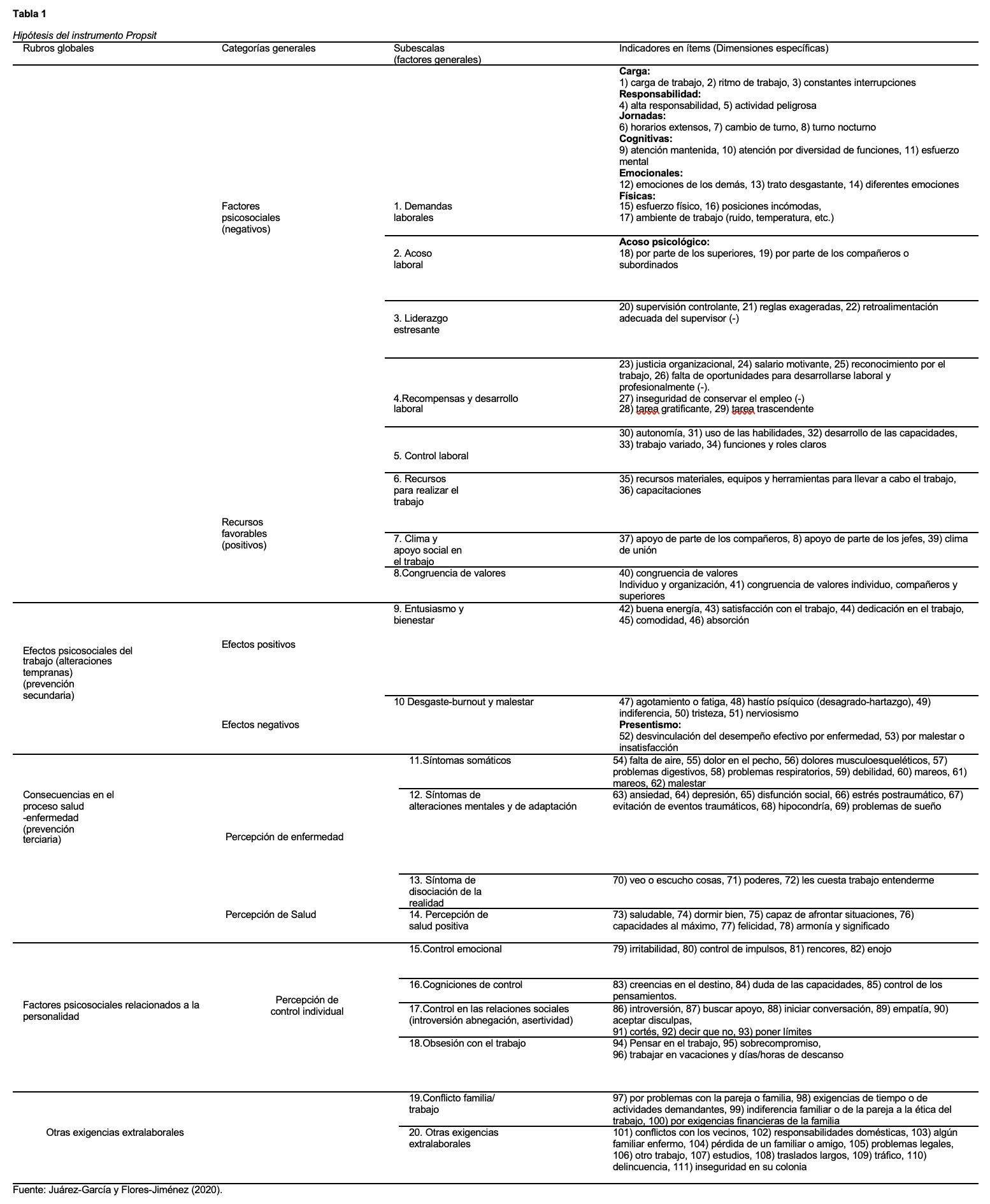 El Propsit (Tabla 1) consta de 111 ítems distribuidos en 20 dimensiones que se agrupan en cinco rubros globales, clasificados según el nivel de intervención: ocho dimensiones en factores psicosociales, que evalúan el entorno organizacional; dos en efectos psicosociales, que miden las consecuencias psicológicas del trabajo; cuatro en percepción de salud y enfermedad, centradas en cómo perciben los trabajadores su estado físico y mental; cuatro en control psicológico individual, que analizan la capacidad autodirigida para afrontar situaciones laborales estresantes; y dos en exigencias extralaborales, que identifican los factores externos al trabajo que pueden afectar el desempeño y el bienestar (Tabla 1). Contiene seis opciones de respuesta 0 = nunca, 1 = rara vez, 2 = de vez en cuando, 3 = regularmente, 4 = frecuentemente, 5 = muy frecuentemente y 6 = siempre. En la Tabla 1 del instrumento se presenta la clasificación de todos los elementos que lo componen de manera hipotética.