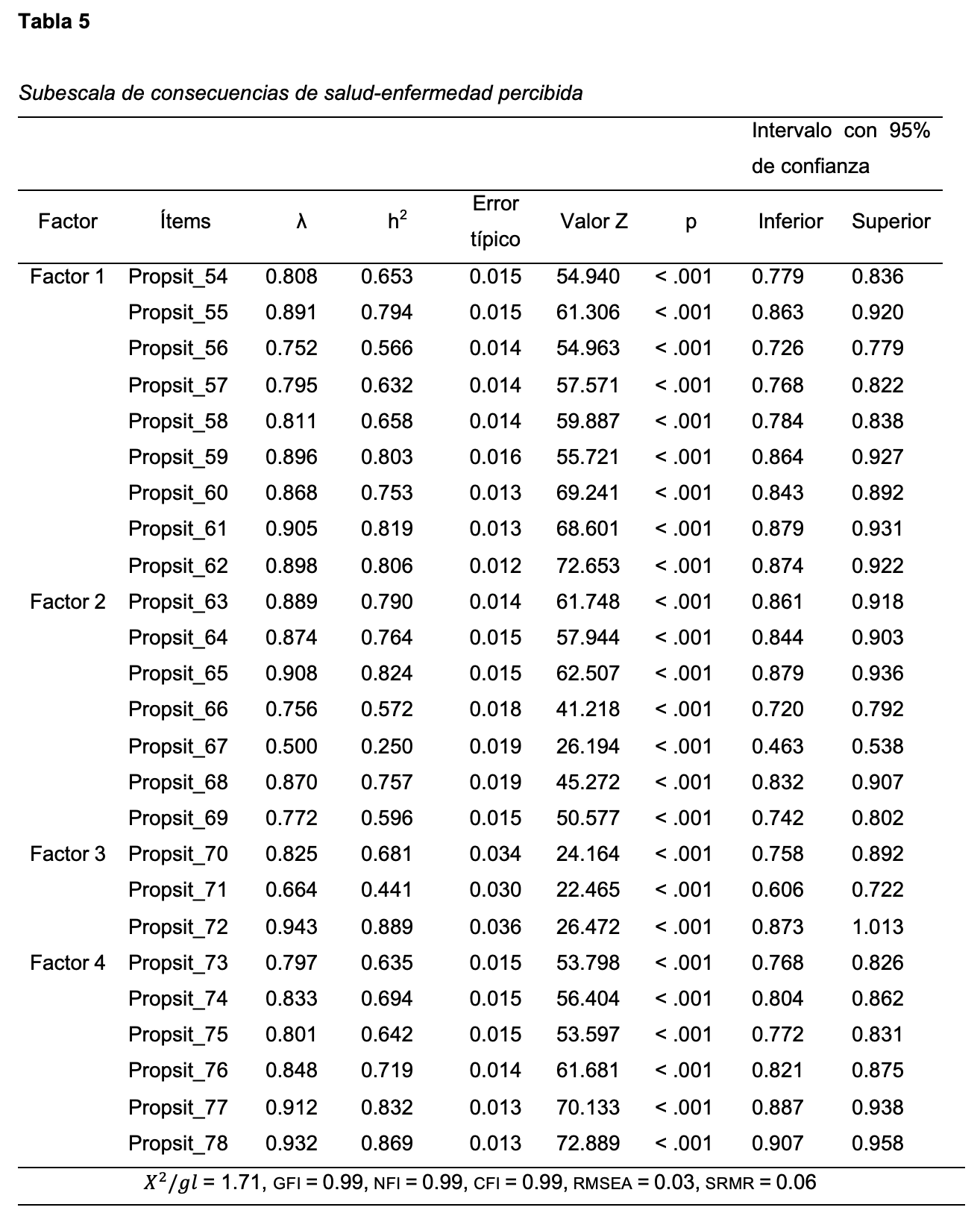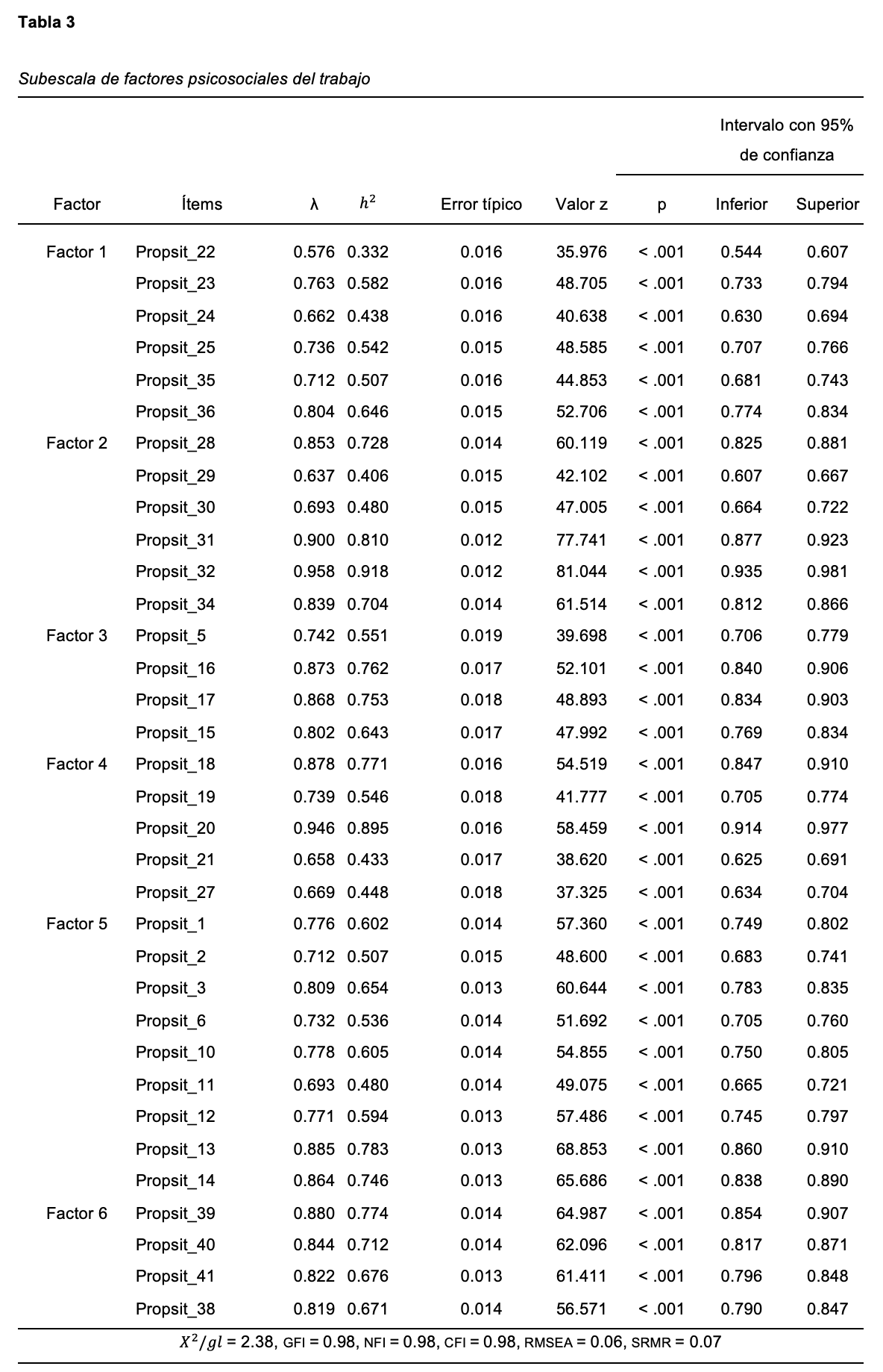 Para averiguar la estructura factorial del instrumento, se llevaron a cabo los AFC en el software JASP con los ítems pertenecientes a cada una de las dimensiones de las subescalas: factores psicosociales (Tabla 3), efectos psicosociales (Tabla 4), consecuencias de salud-enfermedad (Tabla 5), factores psicosociales relacionados con la personalidad (Tabla 6) y exigencias extralaborales (Tabla 7). Lo anterior respetando la coherencia teórica propuesta por el Propsit. El método de estimación que se utilizó fue el de Mínimos Cuadrados Ponderados (DW) con corrección robusta, recomendado para el AFC cuando se trabaja con escalas tipo Likert y los datos presentan anormalidad multivariada (Distefano & Morgan, 2014; Muthén & Kaplan, 1992) y cuyas ventajas son la inclusión de un menor sesgo observado en los errores estándar de las estimaciones de los parámetros y un mejor rendimiento de los índices de ajuste (Distefano & Morgan, 2014). Como parte del AFC se calcularon y analizaron los índices de ajuste comparándolos con los niveles establecidos por la nom-035-stps-2018 (Diario Oficial de la Federación, 2018): X2 / gl (con valores < 0.5), CFI, GFI, NFI (> 0.90) y el RMSEA y SRMR (< 0.08).