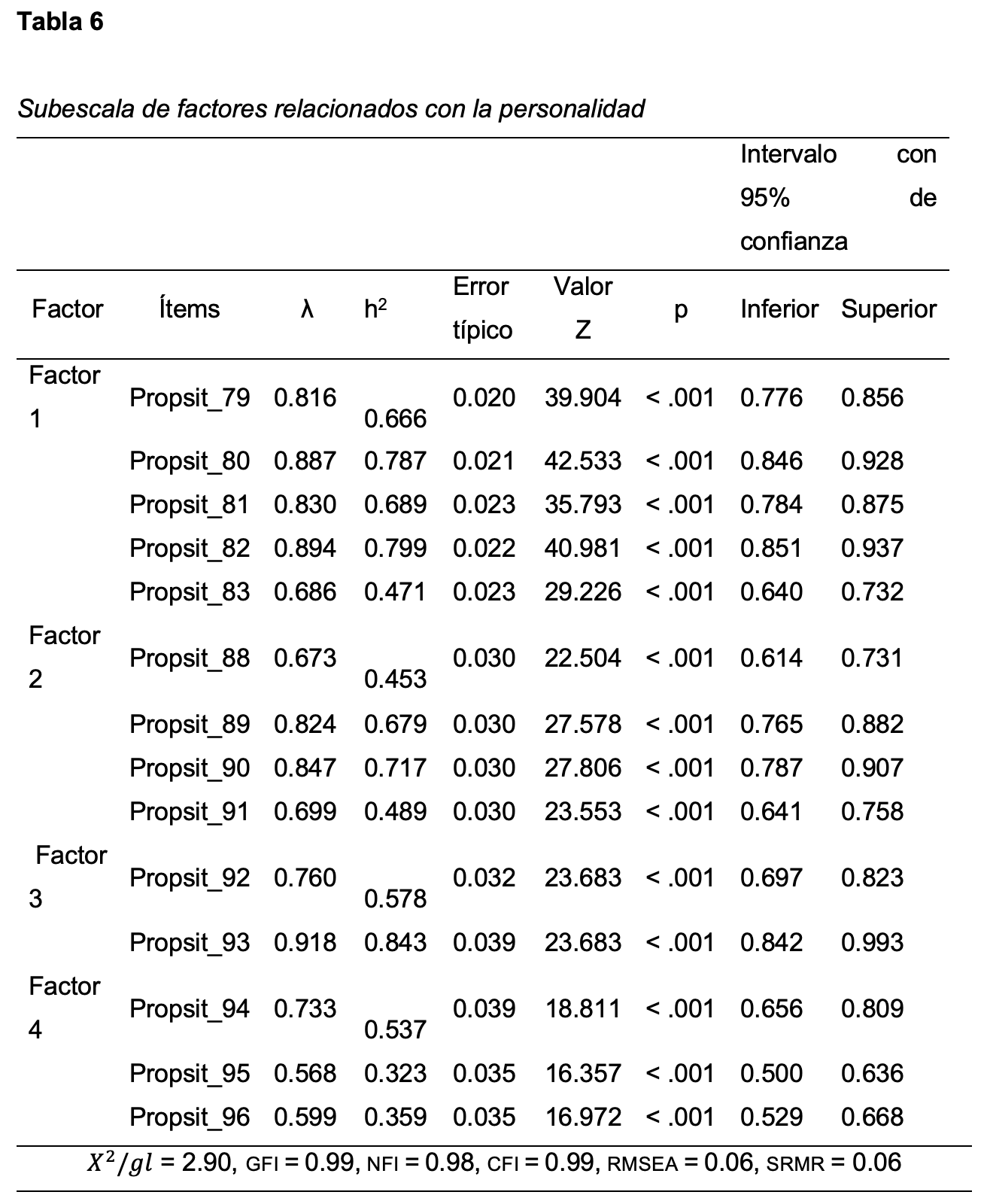 En la subescala de factores relacionados con la personalidad se eliminaron varios ítems por cargas factoriales bajas. Primero los ítems 85 y 89, y posteriormente se eliminaron los 83, 84, y 87. Además, se encontró que el índice rmsea mejoraba significativamente de 0.2 a 0.06 si los ítems 92 y 93 se agrupaban en un único factor, los cuales hacen referencia a la “asertividad”. A diferencia de Juárez-García y Flores-Jiménez (2020), se incluyó el ítem 83 (creencias en el destino), el cual se agrupó en la dimensión de “control emocional”. Los índices obtenidos fueron: X2/ gl = 2.90, gfi = 0.99, nfi = 0.98, cfi = 0.99, rmsea = 0.06 y srmr = 0.06 (Tabla 6).
