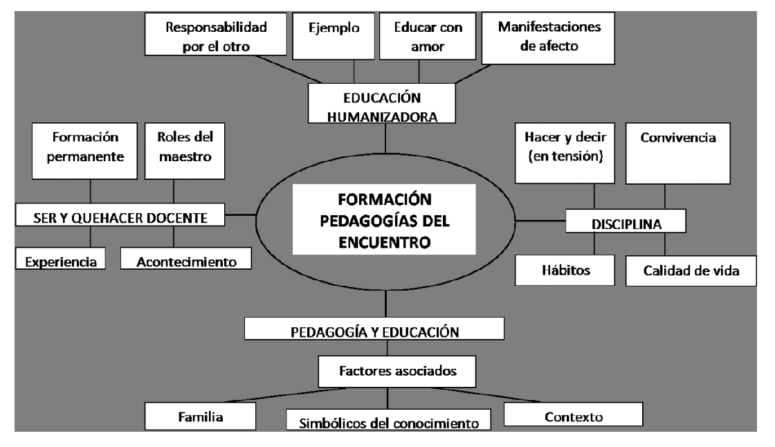 Como resultado del procesamiento de la información, en el marco de la investigación se construye un esquema4, donde emerge como categoría central la formación y las pedagogías del encuentro, de allí se desprenden cuatro tópicos: educación humanizadora, ser y quehacer docente, disciplina y educación y pedagogía;