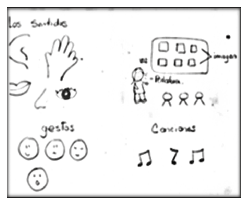 Siempre el encuentro, es integral porque uno utiliza todos los sentidos para darles una comunicación a los estudiantes. Entonces yo dibujé los sentidos, porque me comunico a través de la visión, a través del olfato; del tacto; porque yo tengo mucho contacto con ellos, los abrazo, los toco, los estimulo, con una palmadita en el hombro, a través del oído; porque los escucho, a través de todo el ser, de todo el cuerpo nos comunicamos, ahí en esa comunicación entre ellos y la profesora también está. (MF).