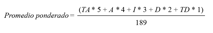 El test se aplicó a 500 estudiantes, pero fueron descartados aquellos que estaban incompletos o mal diligenciados, para generar la muestra definitiva de 189 participantes. En la Tabla 2 se muestra el conteo de los participantes que seleccionaron para cada ítem (del ítem 1 al ítem 45) las opciones: totalmente de acuerdo (TA), de acuerdo (A), indeciso (I), en desacuerdo (D), totalmente en desacuerdo (TD), y el promedio ponderado que se determinó empleando la