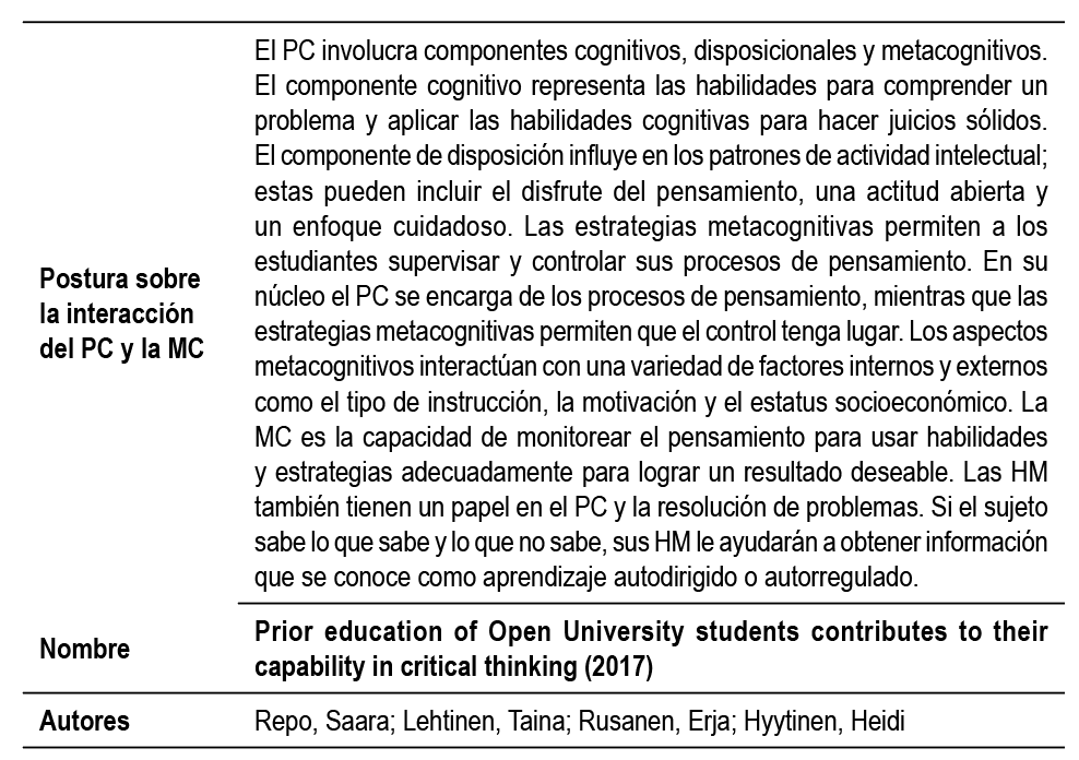 En este orden, diversos autores (Ellerton, 2015; Hogan et al., 2015; Kuhn & Dean, 2004; Laur, 2015; Lozano, 2016; Magno, 2010; Saiz, 2002; Tamayo, 2014) han afirmado que el desarrollo del PC implica la conciencia del propio pensamiento y la reflexión sobre los procesos mentales como un objeto de la cognición, es así como la MC ha sido considerada un complemento favorecedor al PC. Igualmente, tanto la MC como el PC buscan el alcance de “la conciencia y la gestión del propio conocimiento” (Kuhn & Dean, 2004, p. 270) o siguiendo a Flavell (1979, p. 4) es “pensar sobre el pensamiento”, por lo anterior se ha llegado a exponer que entre la MC y el PC existe una interacción ya que ciertas habilidades cognitivas de un nivel ejecutivo son alcanzadas mediante procesos metacognitivos y necesarias para fomentar la generación de pensadores críticos (Bassett, 2016; Dwyer et al., 2014; Hogan et al., 2015; Magno, 2010; Maynes, 2017; Parrott & Rubinstein, 2015; Repo & Hyytinen, 2017).