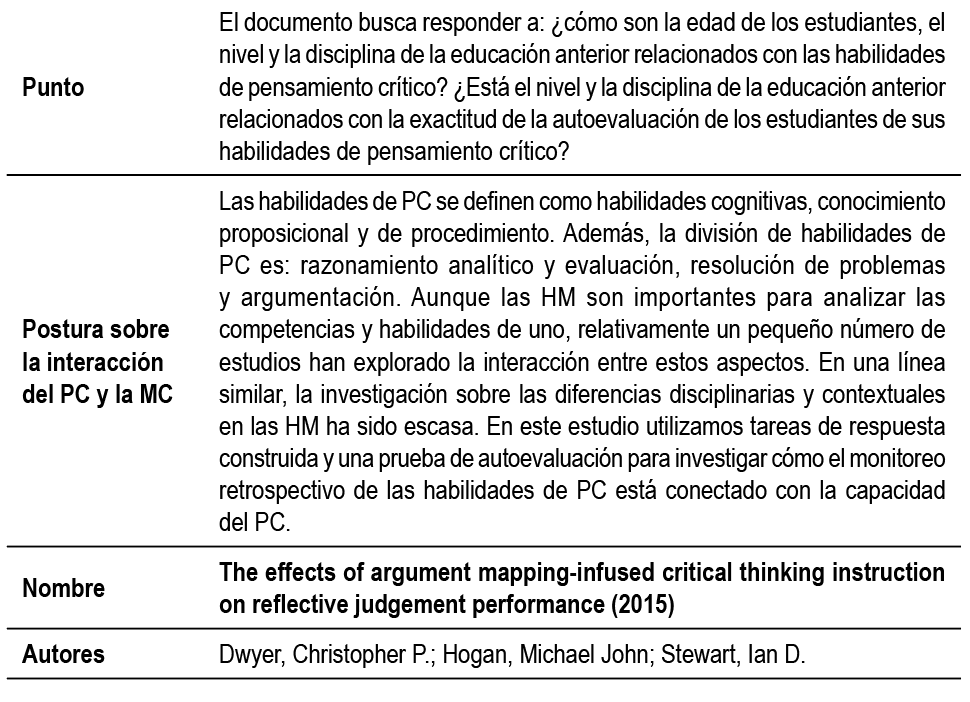 Así mismo, los estudios de Bensley & Spero (2014) y Lawson et al. (2015) aun cuando identifican la importancia de la formación de pensadores críticos por medio de HM, difieren sobre en cómo ocurre esta formación, por ejemplo, mientras unos exponen que el ideal son pensadores críticos capaces de identificar sus carencias de conocimiento metacognitivo, otros abogan por fomentar el conocimiento del propio pensamiento, permitiendo desarrollar habilidades del PC.