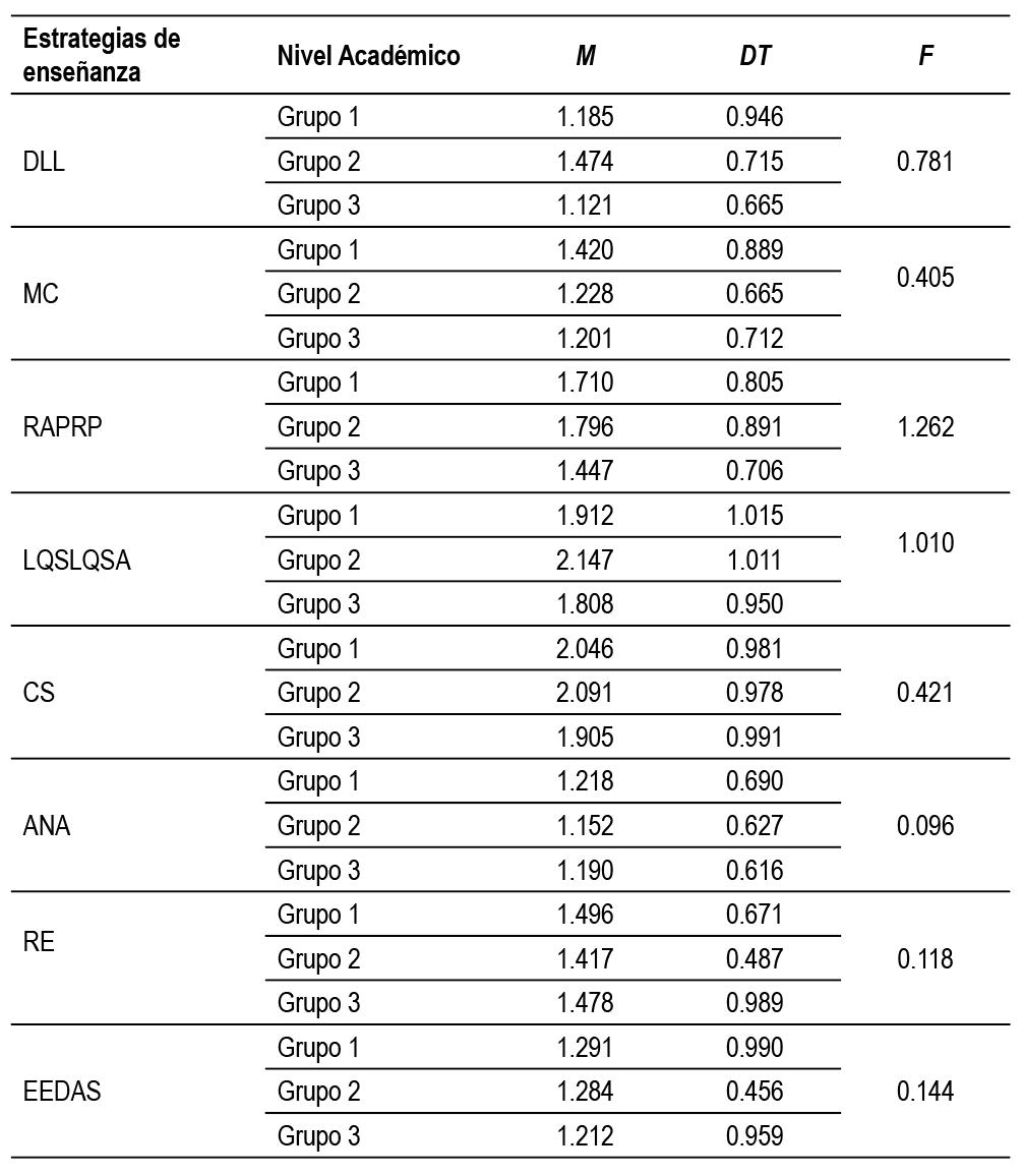 En el análisis de varianza (Tabla 3) se compararon las puntuaciones obtenidas en cada uno de los tres grupos. No se encontraron diferencias en el uso de las estrategias de enseñanza entre los tres niveles académicos estudiados.