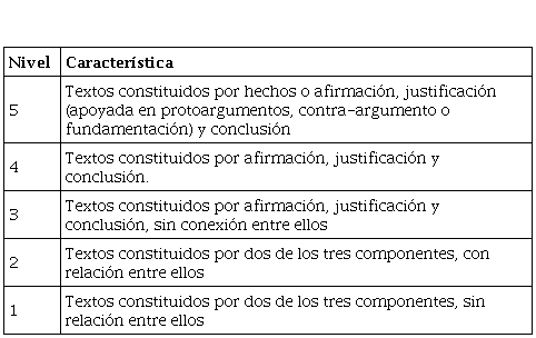 En los textos antes expuestos se puede notar lo siguiente: la presencia de afirmaciones (A-C) y de justificaciones (J) y un protoargumento (P). Según la rúbrica utilizada, la presencia de estos elementos permite ubicar los textos en un nivel argumentativo 4. Además, en relación con la coherencia del texto se puede decir que hay una significación global de su concepto, pero se requiere mayor relación entre los elementos estructurales para poder dar mayor solidez a la justificación central que apoya a las afirmaciones.