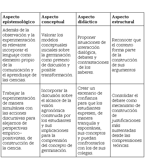 · En la relación con la aplicación conjunta del patrón estructural y temático, se encontró una correspondencia entre los aportes de cada uno para alcanzar los propósitos establecidos. Esto porque, el concepto germinación de semillas se configuró como un escenario para propiciar acciones argumentativas a partir de elementos contextuales, con un fuerte valor cultural, y elementos desde la biología que llevaron a los estudiantes a la confrontación de ideas y conceptos, la negociación de algunos elementos, como el modelo de semilla y la construcción de textos argumentativos para defender y presentar razones sobre el conjunto de fenómenos relacionados con el concepto; y por lo tanto, la argumentación se convirtió en una estrategia propicia para orientar a los estudiantes hacia la reconstrucción del concepto a través de la interacción discursiva entre maestro y estudiantes y entre los estudiantes mismos, implicando espacios de discusión y negociación en el aula.
