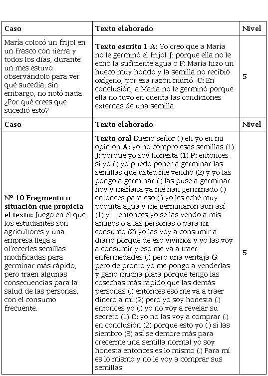 La información de los grupos de discusión se recogió en audio y transcribió siguiendo la propuesta de Candela (2001) y Ruiz et al. (2015). Antes se mencionó que el análisis de contenido se aplicó para los patrones temático y estructural de las respuestas de los estudiantes. El análisis del patrón estructural (concepto, etapas y factores que condicionan la germinación) permitió configurar los modelos conceptuales expresados por los estudiantes (Zapata y Ruiz, 2016; Ruiz et al., 2015) y, el análisis del patrón estructural (estructura del texto elaborado oral y escrito) permitió, de un lado, la identificación de la estructura argumentativa de los textos orales (grupos de discusión) y escritos (cuestionario) y, de otro lado, la ubicación, en niveles argumentativos, de cada caso estudiado (Ruiz et al., 2015). Para la estructura de los argumentos se tuvo en cuenta la propuesta de Sanmartí y Sardà (2000), quienes reconocen, la existencia de tres componentes fundamentales: afirmación, justificación y conclusión, que pueden ubicarse en niveles argumentativos (tabla 1).