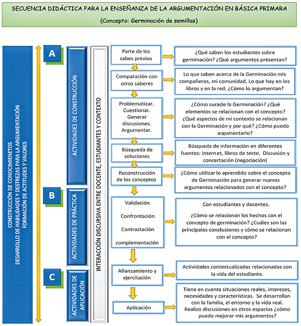 Abstract: Objective: A proposal for the teaching of argumentation in elementary school is presented as an alternative for the co-construction of conceptual models based on the discursive interaction between teacher and students. Method: The study was conducted with fifth grade students in a rural educational institution in Colombia. The information obtained was analyzed through content analysis, considering two aspects: the thematic pattern and the structural pattern in the structural analysis of the oral and written argumentative texts prepared by the students. Results: Regarding the structural pattern, the highest frequency levels were located in 1, 2 and 3 and; concerning the thematic pattern, it was possible to identify the noticeable influence of the family context, their sowing and cultivation practices in the region. Conclusions: A significant advance was found in the learning of the germination concept and the appropriation of the structure of the argumentative text, which suggests a way of approaching the teaching of argumentation in the elementary school.