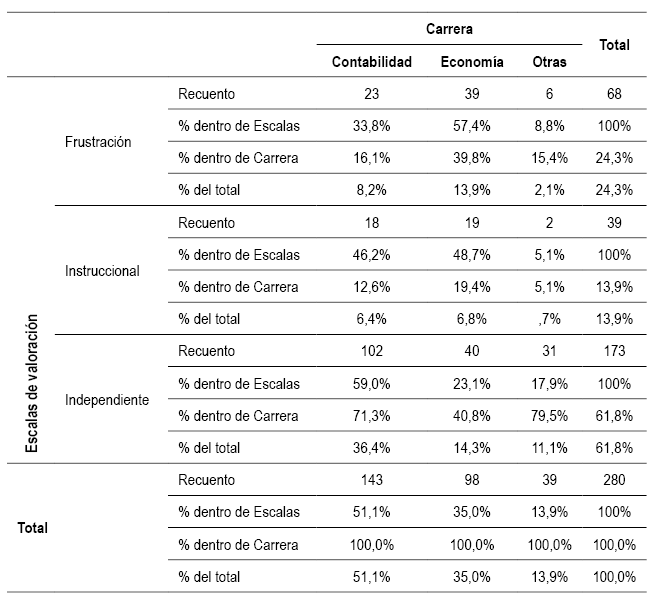 En el contraste entre carreras analizadas: contabilidad, economía (UTA) y otras como ingeniería en sistemas, administración y psicología (PUCESA) hay diferencias significativas entre los niveles funcionales de comprensión lectora: frustración, instruccional. independiente; básicamente la carrera con mayor nivel de frustración es economía, entiéndase que esta profesión requiere de un alto grado de abstracción matemática dada la complejidad de sus modelos y análisis de la realidad social en términos de dinámica y desarrollo de la administración de los recursos escasos. Se requieren competencias elevadas en comprensión lectora para el entendimiento de la realidad económica, significa entonces que, de acuerdo con este estudio, aquí se aglutinan estudiantes con porcentajes por debajo del 43% de comprensión lectora.