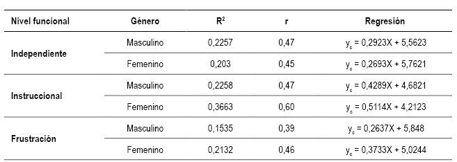 Para la mayoría del análisis correlacional son muy significativas y evidencian ajustes moderados y fuertes entre variables, por ejemplo, en el nivel funcional independiente hay una correlación moderada en el género masculino (0,47), (ver tabla 3); instruccional (0,6) para femenino y frustración (0,46) femenino.