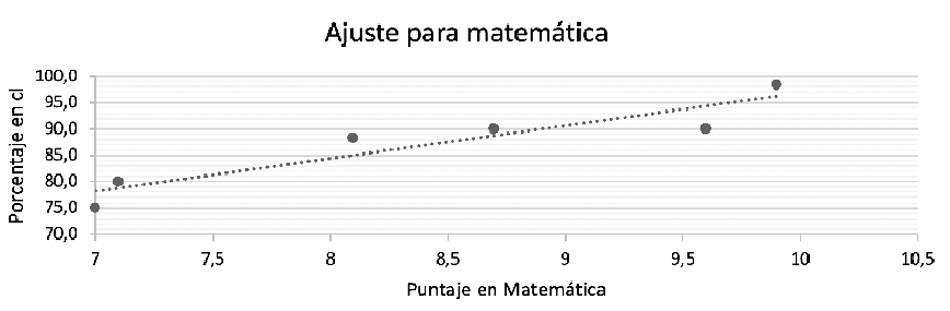Del mismo modo se modela una ecuación de regresión lineal para la asignatura de lenguaje, cuyo resultado es el siguiente: y. = 7,7148X + 26,482, con un . de Pearson de 0,9632. Este modelo proyecta el porcentaje que requiere alcanzar en comprensión lectora para obtener la nota esperada en la asignatura analizada. Para este caso la prueba de significación evidencia estos resultados: t(2,36) = 7,17 con α 0,05; esto demuestra que hay una relación lineal significativa.