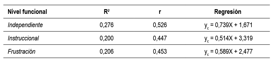 Considerando los niveles funcionales: independiente, instruccional y de frustración se correlacionó con el género y las dos asignaturas contempladas (matemática y lenguaje) en el estudio (Tabla 3).