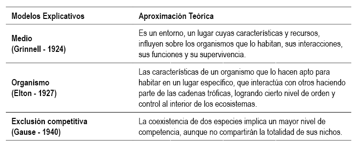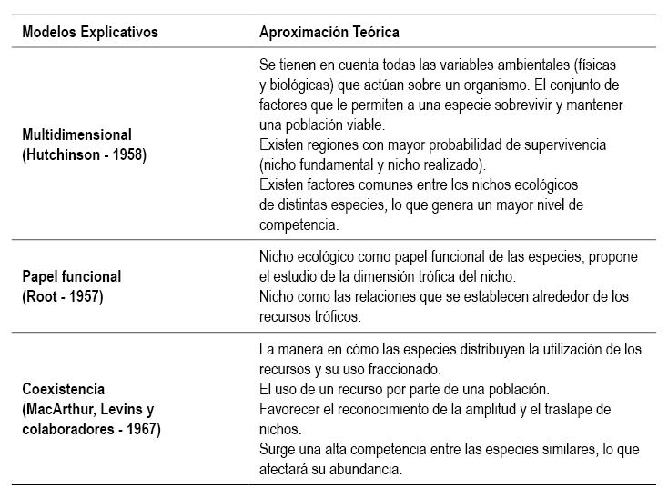 Inicialmente se consigue identificar tres modelos explicativos asociados al concepto de nicho ecológico (Figura 1).