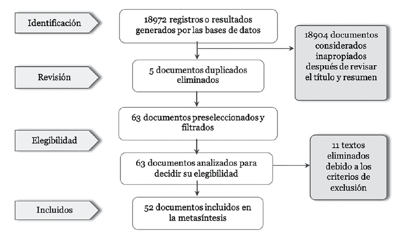 El diseño que se llevó a cabo para enfrentar la pregunta fue una metasíntesis o metarresumen cualitativo, siendo un tipo de investigación sistemática que busca integrar o comparar los resultados de investigaciones, a través de una síntesis de los datos cualitativos y los hallazgos descriptivos cuantitativos (Sandelowski et al., 2007). Elegido, debido a que las investigaciones poseen distintos enfoques y este método permite realizar un análisis e interpretación de los resultados más allá del método o perspectiva epistemológica, siempre con el fin último de generar nuevas interpretaciones o teorías (Carrillo-González et al., 2007) de manera inductiva, a partir de códigos descriptores, nominales y categorías que permitieron agrupar los hallazgos (Carreño Moreno y Chaparro Díaz, 2015).