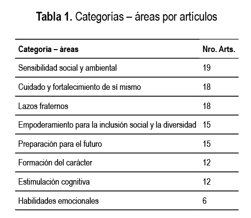 Los estudios comprendidos en esta revisión contribuyen a identificar la posible existencia de áreas fortalecidas en los niños y jóvenes al participar en el movimiento Scout. De acuerdo con lo encontrado en el análisis y codificación de la información se lograron conformar ocho categorías reconocidas como áreas claves para este escrito y de interés para los investigadores que se han trabajado, según se observa en la tabla 1.