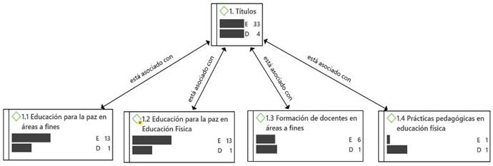 La categoría títulos corresponde a la manera como los investigadores nombran los estudios realizados, y vinculan parte de los ejes temáticos centrales que allí se desarrollan, además, relacionan las categorías centrales del estudio. Los títulos analizados están conformados por las siguientes subcategorías: educación para la paz en áreas afines, educación para la paz en educación física, formación de docentes en áreas a fines y prácticas pedagógicas en educación física, las cuales surgen producto a las formas de nombrar las investigaciones por parte de los investigadores.