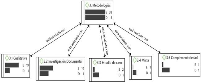 En este caso en específico los estudios analizados son de carácter práctico, con mayores recurrencias los de corte cualitativo con 19 en total, luego la investigación documental con 10 recurrencias, y seguidamente los de estudio de caso con 2 recurrencias, investigación mixta con 1 recurrencia y complementariedad con 1 recurrencia.