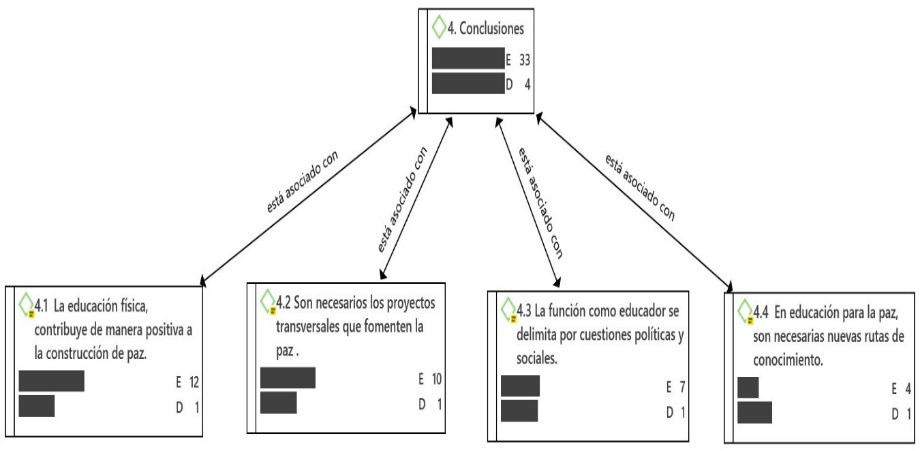 En el ejercicio de categorización emergen diferentes redes semánticas, que recogen las relaciones entre las categorías principales y permiten la visualización de las tendencias investigativas, permitiendo así, la identificación de las posturas frente a la construcción de paz y los aportes que surgen para la formación de maestros y el campo de la educación física, la recreación y el deporte en el ámbito educativo.