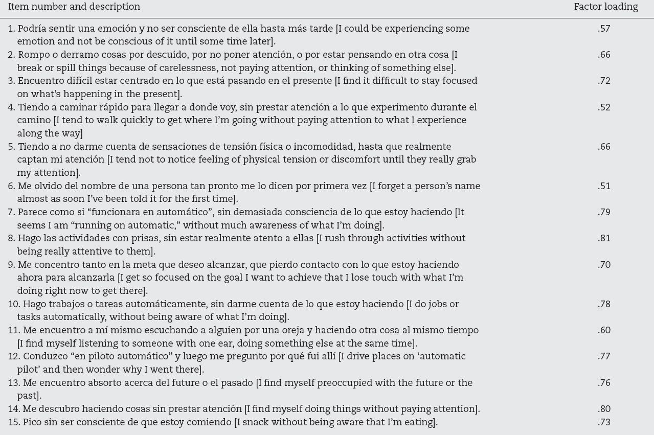 The conducted CFA supported the one-factor model of the MAAS. The overall fit was adequate and scores on the goodness-of-fit indexes were good for the RMSEA (.063, 90% CI [.056, .070]), and very good for the CFI and NNFI (.99 and .98, respectively). Table 1 shows the original items, their translation into Spanish, and factor loadings for the one-factor model.
