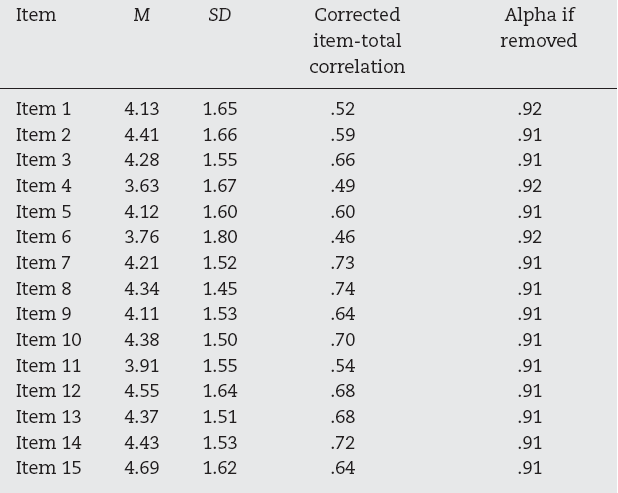 The remaining statistical analyses were performed on SPSS 19©. Cronbach's alphas providing confidence intervals according to Duhacheck and Iacobucci (2004) were computed to explore the internal consistency of the MAAS. Corrected item-total correlations were obtained to identify items that should be removed because of low discrimination item index (i.e., values below .20). Descriptive data were also calculated. To examine discriminant construct validity, scores on the MAAS were compared by computing Student's t, between participants with scores above and below the cutoff on the GHQ-12. Zero-order correlations between the MAAS and the other scales were calculated to assess convergent and divergent construct validity.