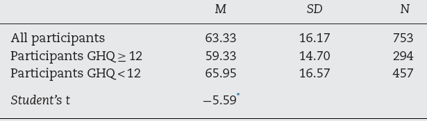 Cronbach's alpha of the MAAS was .92 (95% CI [.91, .93.]). Table 2 shows the descriptive statistics for each item of the MAAS. Corrected item-total correlations of the MAAS ranged from .46 to .74. The removal of any item did not improve the alpha of the scale. Participants with scores above the cut-off on the GHQ-12 scored statistically and significantly lower on the MAAS than those with scores below this cutoff (see Table 3 ).