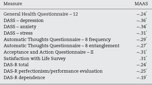 The results of the current study suggest that the MAAS is a valid and reliable measure of mindfulness in Colombian samples. Specifically, the MAAS showed excellent internal consistency (α = .92), and all items showed adequate corrected item-total correlations. The CFA replicated the onefactor structure commonly found in other studies ( Brown & Ryan, 2003 ; Soler et al., 2012 ). All correlations found with other instruments were in the expected direction: the MAAS correlated positively with life satisfaction and negatively psychological inflexibility, dysfunctional attitudes, emotional symptoms, and the frequency of automatic negative thoughts and entanglement with them. Although correlations were relatively small, they were similar to those obtained in other studies ( Long & Hayes, 2014 ; Soler et al., 2012 ). The MAAS also presented discriminant validity to the extent that participants who scored above the cutoff on the GHQ-12 scored significantly lower on the MAAS than those who scored below the cutoff.