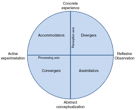 The theory proposes a method for describing how students solve problems and apply new knowledge from personal experience within their learning environment. It considers the psychological processes of perception and processing. Students' experiences are classified along two axes; one whose poles represent concrete experience and abstract conceptualisation and another that represents a continuum between active experimentation and reflexive observation . The combined scores on each axis indicate which of the four categories of learning styles best describes the student ( Fig. 1 ).
