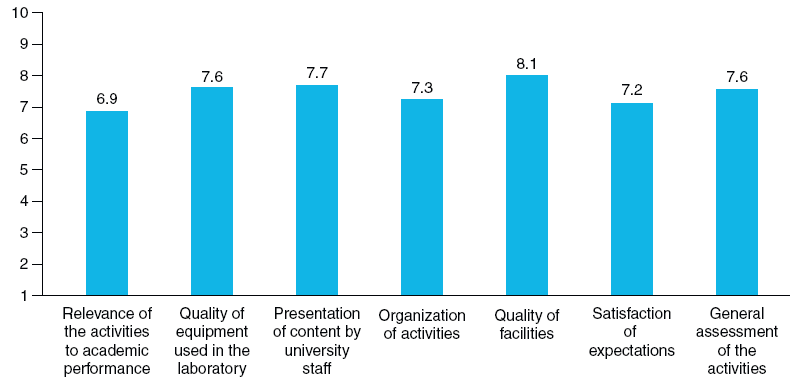 Satisfaction Scale . This scale measured students' level of satisfaction with the learning activities and was composed of 7 items (α = .919) that were assessed on a scale from 1 = very bad to 10 = very good . The items measure the relevance of the activities to academic performance; quality of equipment used in the laboratory; presentation of content by university staff; organisation of activities; quality of facilities; satisfaction of expectations; and general assessment of the activities.