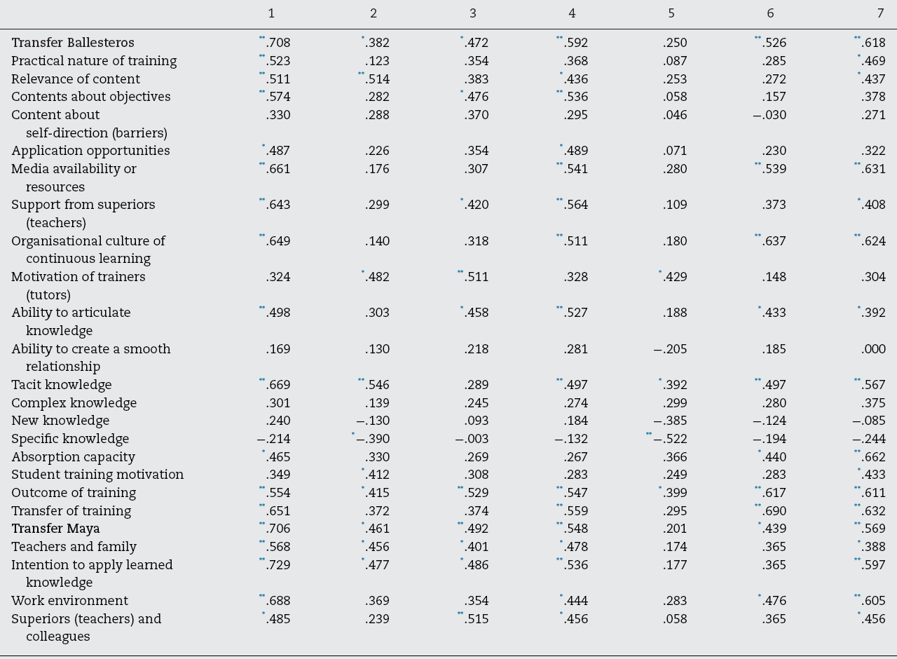 Several additional positive moderately strong correlations were found. The strongest correlations were found between “the relevance of the activities to academic performance” and Ballesteros's “media availability or resources” ( r = .661; p < .01); “support from superiors (teachers)” ( r = .643; p < .01); “organisational culture of continuous learning” ( r = .649; p < .01); “tacit knowledge” ( r = .669; p < .01); and “transfer of training” ( r = .651; p < .01) dimensions. Correlates were also found with Maya's “intention to apply learned knowledge” ( r = .729; p < .01) and “work environment” ( r = .688; p < .01) dimensions.