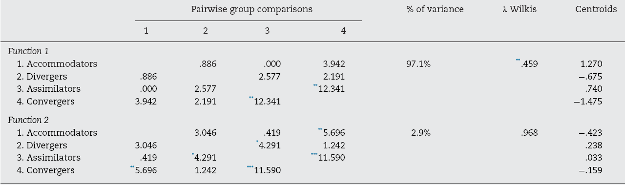 Table 2 shows the results of a stepwise discriminant analysis, which revealed that two functions, “Student training motivation” (Function 1) and “media availability or resources” (Function 2), significantly explained the model. The former explained 97.1% of the model variance and the latter only 2.9%. The full model distinguishes between the groups (Wilks' λ = .459; χ2= 21.028; Sig. = .002). However, the second function alone is not adequate to distinguish the groups (Wilks' λ = .968; χ2= .879; Sig. = .644).