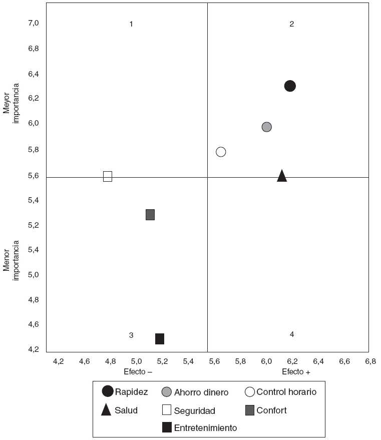 Los cuatro cuadrantes en la figura 1 representan todas las combinaciones posibles de importancia (alta y baja) y efectos percibidos (positivos y negativos). Los aspectos en los cuadrantes 1 y 2 son relativamente más importantes que aquellos en los cuadrantes 3 y 4, y los efectos del STPB sobre los aspectos en los cuadrantes 2 y 4 se perciben como relativamente más positivos que aquellos en los cuadrantes 1 y 3. Tres de los aspectos se situaron en el cuadrante 2, lo que significa que eran muy importantes para los usuarios, y que la bicicleta pública produjo un efecto muy positivo sobre ellos. Estos aspectos fueron la rapidez para llegar a destino, el control del horario de llegada y el ahorro de dinero. La salud y la seguridad obtuvieron el mismo nivel de importancia, que fue relativamente menor que el de los otros tres aspectos. No obstante, el efecto del sistema sobre la salud se percibió como altamente positivo, por lo que se ubicó en la intersección de los cuadrantes 2 y 4. En cambio, el efecto del STPB sobre la seguridad al viajar se percibió como relativamente menos positivo, por lo que se ubicó en la intersección entre los cuadrantes 1 y 3. Finalmente, los aspectos comodidad y entretenimiento se ubicaron en el cuadrante 3 que representa una importancia relativamente más baja y un efecto menos positivo en comparación al percibido para los otros aspectos. Finalmente, ningún aspecto se situó en el cuadrante 4 que representa una importancia menor pero un efecto muy positivo del STPB sobre el mismo.