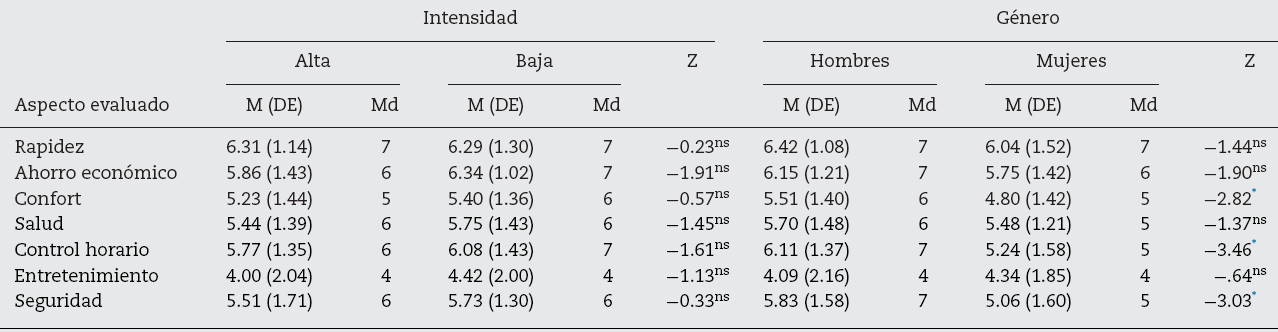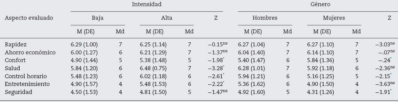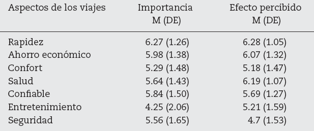 Todos los aspectos evaluados obtuvieron una puntuación por encima de la media de la escala de importancia ( M > 4). El aspecto más valorado en el momento de elegir un medio de transporte fue la rapidez, seguido por lo económico y confiable, mientras que la puntuación más baja la obtuvieron los aspectos entretenido y confortable.