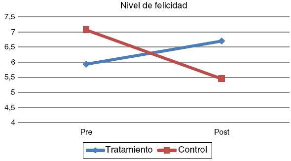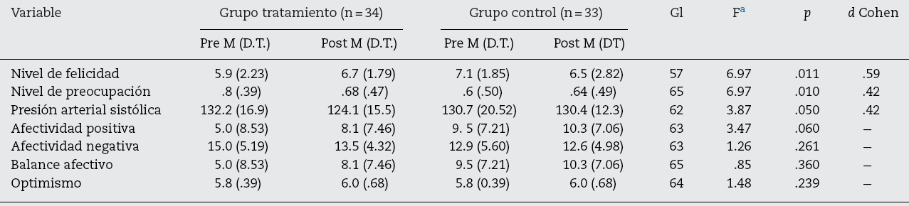 En primer lugar se comprobó, con resultados favorables, que las variables cumplieran los supuestos de normalidad estadística y el supuesto de homocedasticidad. Los análisis multivariados de medidas repetidas ANOVA indicaron que existe una interacción significativa de grupo por momento pre y postintervención, en las variables nivel de felicidad (F(1,57)= 6,97; p = 0,01), nivel de preocupación (F(1,65)= 3,87; p = 0,05), presión arterial sistólica (F(1,62)= 3,87; p = 0,05) y, de manera marginal, afectividad positiva (F(1,63)= 3,47; p = 0,06). Estos resultados sugieren que existen diferencias entre los participantes que han formado parte del grupo de tratamiento y del grupo control (los datos normativos de las variables y los análisis ANOVA aparecen en la tabla 1 ).