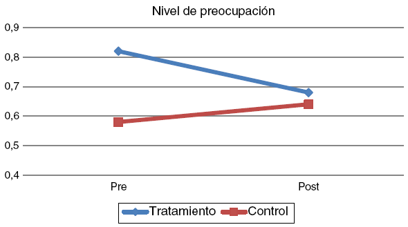 La comparación por pares, ajuste Bonferroni, de la interacción grupo por momento (I − J = M de la variable pretratamiento(I)− M de la variable postratamiento(J)), muestra que el grupo en tratamiento presenta incremento (I − J= −0,83; p = 0,035) del nivel de felicidad ( fig. 1 ) y disminución tanto del nivel de preocupación (I-J = 0,25; p = .035), como de la presión arterial sistólica (I − J = 8,13; p = .012), como puede verse en las figuras 2 y 3 , respectivamente.