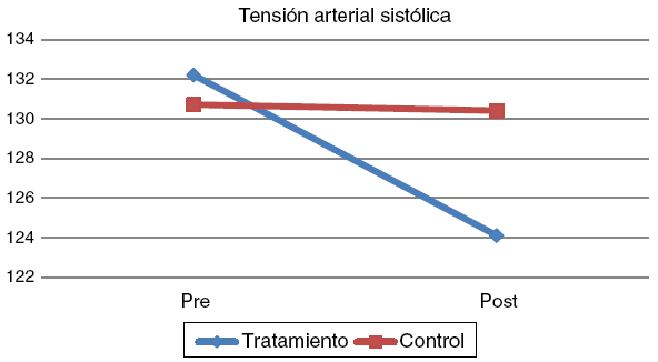 La disminución de la presión arterial sistólica del grupo que siguió la intervención es relevante en diferentes sentidos. En primer lugar, por las implicaciones médicas de la hipertensión arterial, cuya prevalencia en la población de personas mayores es relevante, pues ocupa el segundo lugar de las enfermedades crónicas más diagnosticadas en este colectivo, con un 51,9% de personas que la padecen ( IMSERSO, 2008 ). En segundo lugar, la presión arterial es un indicador objetivo de estrés ( Dusek et al., 2008 ) y está vinculada a factores emocionales ( Sanchez-Gonzalez, May, Koutnik, & Fincham, 2015 ). Las investigaciones muestran de manera consistente la relación significativa entre una adecuada regulación emocional y la disminución de la presión arterial ( Garfinkel et al., 2016 ; McCubbin et al., 2011 ), si bien aún se desconoce con precisión cómo se produce esta relación. Aunque es necesario continuar estudiando los mecanismos psicofisiológicos que subyacen la relación entre ambas variables, los datos dan indicios de la importancia de trabajar la regulación emocional y la promoción de emociones positivas como una vía no solo para incrementar el bienestar emocional, sino también para mejorar la salud física y cognitiva ( Bains et al., 2014 ).
