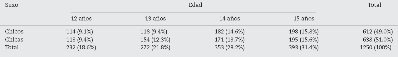 La muestra estaba formada por 1250 adolescentes (49% chicos y 51% chicas) de edades comprendidas entre 12 y 15 años ( M = 13.72, DT = 1.09). La chi cuadrado de Pearson indicó que no había diferencias en la segmentación del número de participantes de cada sexo en las diferentes edades (|2= 4.66, p >. 05); así, resultó una distribución equilibrada ( tabla 1 ).