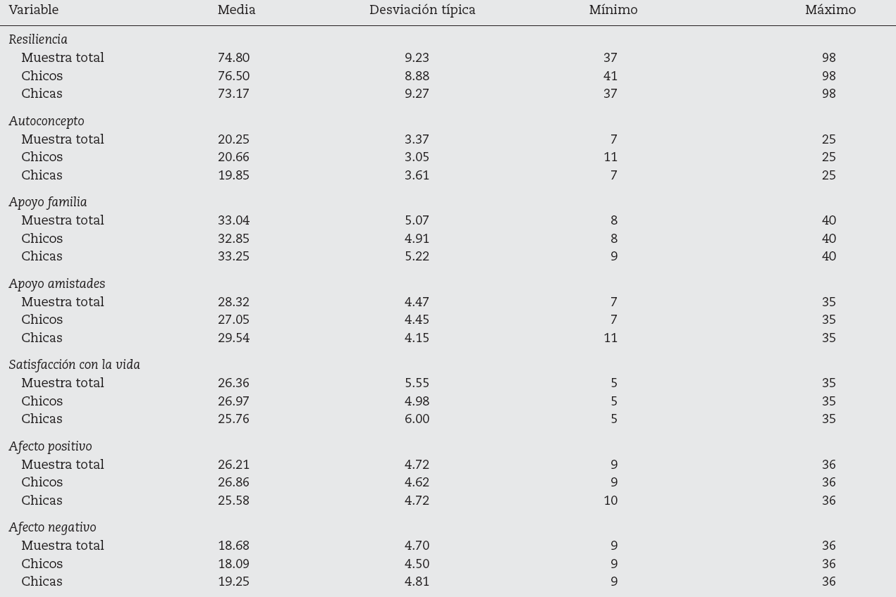 Con respecto a las puntuaciones medias y desviaciones estándar de las variables medidas ( tabla 2 ), se pueden observar valores más altos en resiliencia, autoconcepto, apoyo de las amistades, satisfacción con la vida y afecto positivo a favor de los chicos adolescentes. Por otro lado, las chicas presentan puntuaciones más elevadas en las variables apoyo familiar y afecto negativo.