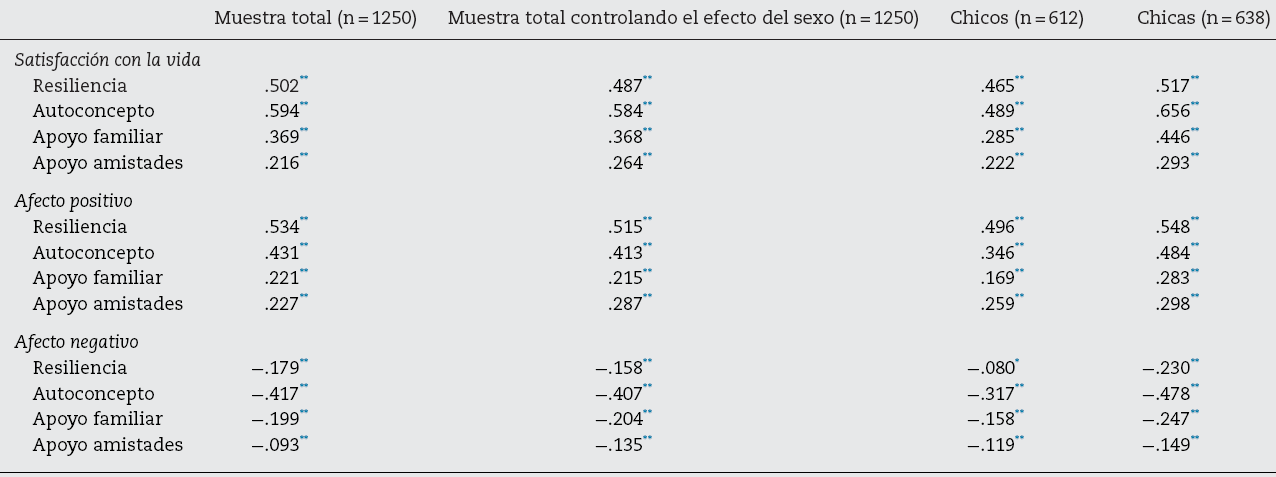 Los coeficientes de correlación de Pearson entre las dimensiones de bienestar subjetivo (satisfacción con la vida, afecto positivo y afecto negativo) con las variables resiliencia, auto-concepto general y apoyo social que han sido calculados tanto para la muestra total como para ambos sexos de manera diferenciada, así como las correlaciones parciales, se exponen en la tabla 3 .
