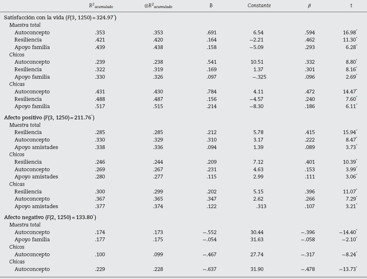 Con el objetivo de identificar las variables que predicen una alta puntuación en bienestar subjetivo, se realizó un análisis de regresión múltiple, método de pasos sucesivos, cuyos resultados se presentan en la tabla 4 . En este análisis se introdujeron como variables dependientes la satisfacción con la vida, el afecto positivo y el afecto negativo, y como variables predictoras la resiliencia, el autoconcepto general, el apoyo familiar y el apoyo de las amistades.