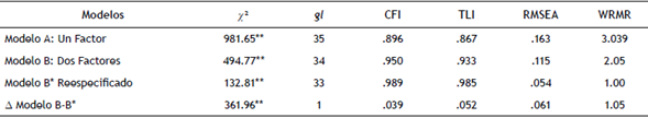 Como se aprecia en la tabla 4 el modelo B y B* de dos factores logran índices de ajustes adecuados (tabla 3). Aún así, el modelo B* reespecificado demuestra un ajuste significativamente mejor. En este último modelo la correlación entre los términos de error es esperable dado el solapamiento en el contenido de los ítems. La tabla 4 da cuenta de los pesos de regresión estandarizados de los ítems en función de las dimensiones consideradas. También se muestran allí los coeficientes alfa de Cronbach obtenidos para cada factor, y se observan valores óptimos de consistencia interna.