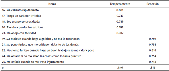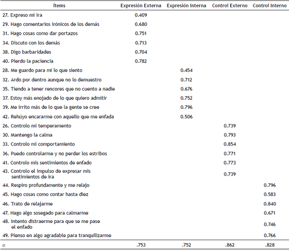 En cuanto a la escala de Rasgo-Ira se mantiene la estructura de dos factores intercorrelacionados denominados Temperamento y Reacción de ira. Finalmente, en la escala de Control y Expresión de ira se aprecia una estructura de cuatro factores: Control Externo e Interno de la ira, y Expresión Externa e Interna de la ira. Todas las dimensiones descritas alcanzaron índices de fiabilidad aceptables y óptimos.