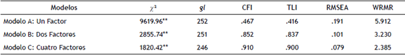 Como se aprecia en la tabla 5 el modelo C de cuatro factores es el único que logra índices de ajustes adecuados. La tabla 6 da cuenta de los pesos de regresión estandarizados de los ítems en función de las dimensiones consideradas. Se muestra allí también los coeficientes alfa de Cronbach obtenidos para cada factor, observándose valores óptimos y adecuados de consistencia interna.
