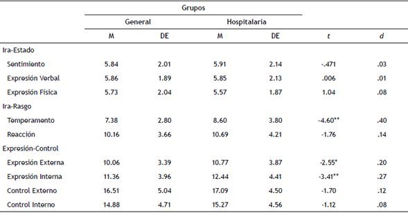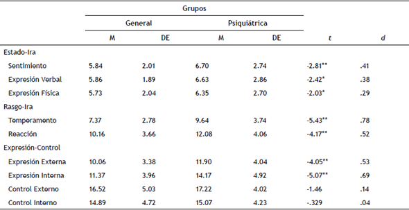 La tabla 7 presenta los sentimientos, rasgos, control y expresión de la ira presentes en población general y hospitalaria. Concretamente se observa una diferencia moderada y en favor de la población hospitalaria con respecto al temperamento de ira. La expresión interna y externa de la ira también es mayor en este último grupo, aunque estas diferencias son de baja magnitud. Estas diferencias se vuelven más claras, y aparecen otras variables distintivas, cuando se compara la población general con la población psiquiátrica (i.e población con trastornos emocionales, tabla 8). Concretamente se observan diferencias en favor del grupo psiquiátrico en el estado de ira (tamaños del efecto entre bajo y moderado), el rasgo de ira (tamaños del efecto entre moderado y alto), y en la expresión interna y externa de la ira (tamaños del efecto moderado).