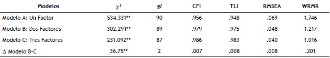 Como se aprecia en la tabla 1 los tres modelos propuestos alcanzan adecuados y óptimos índices de ajustes. Sin embargo, el modelo C de tres factores logra un ajuste significativamente mejor. La tabla 2 da cuenta de los pesos de regresión estandarizados de los ítems en función de las dimensiones consideradas. También se muestran allí los coeficientes alfa de Cronbach obtenidos para cada factor y se observan valores aceptables y óptimos de consistencia interna.
