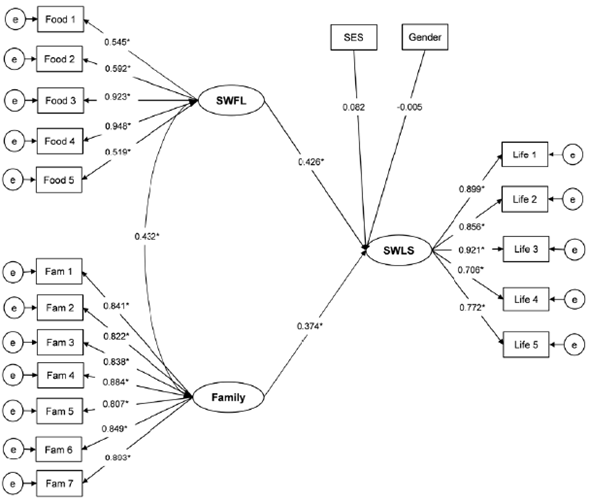 Having controlled for gender and SES, the structural model (Figure 1) showed an acceptable fit for the data (RMSEA = .067, CFI = .954, TLI = .947). The path coefficient of 0.426 indicated a medium level relationship between the SWFL and SWLS. The path coefficient between the Family subscale and the SWLS was direct and significant, which also indicated a medium level relationship. However, the value was slightly lower. Therefore, the results indicate that a student's life satisfaction is related to food satisfaction and, to a lesser extent, a student's family satisfaction. Given these results, it is possible to accept Hypotheses 1 and 2. The correlation (standardized covariance) value of 0.432 indicated a medium level relationship between the SWFL and the Family subscale. Therefore, it is also possible to accept Hypothesis 3.